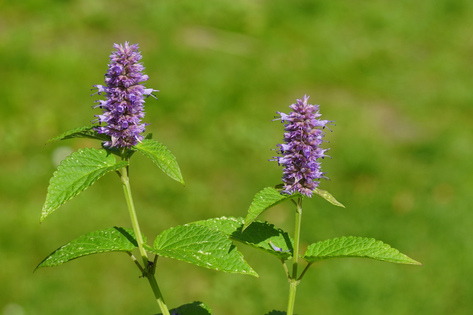 Anise hyssop is a deciduous, herbaceous perennial in the mint family, with aromatic green, leafy upright stems, growing to 0.5–1 m tall (3). The dark green leaves are roughly textured and have soft, grey hairs on the underside (5).