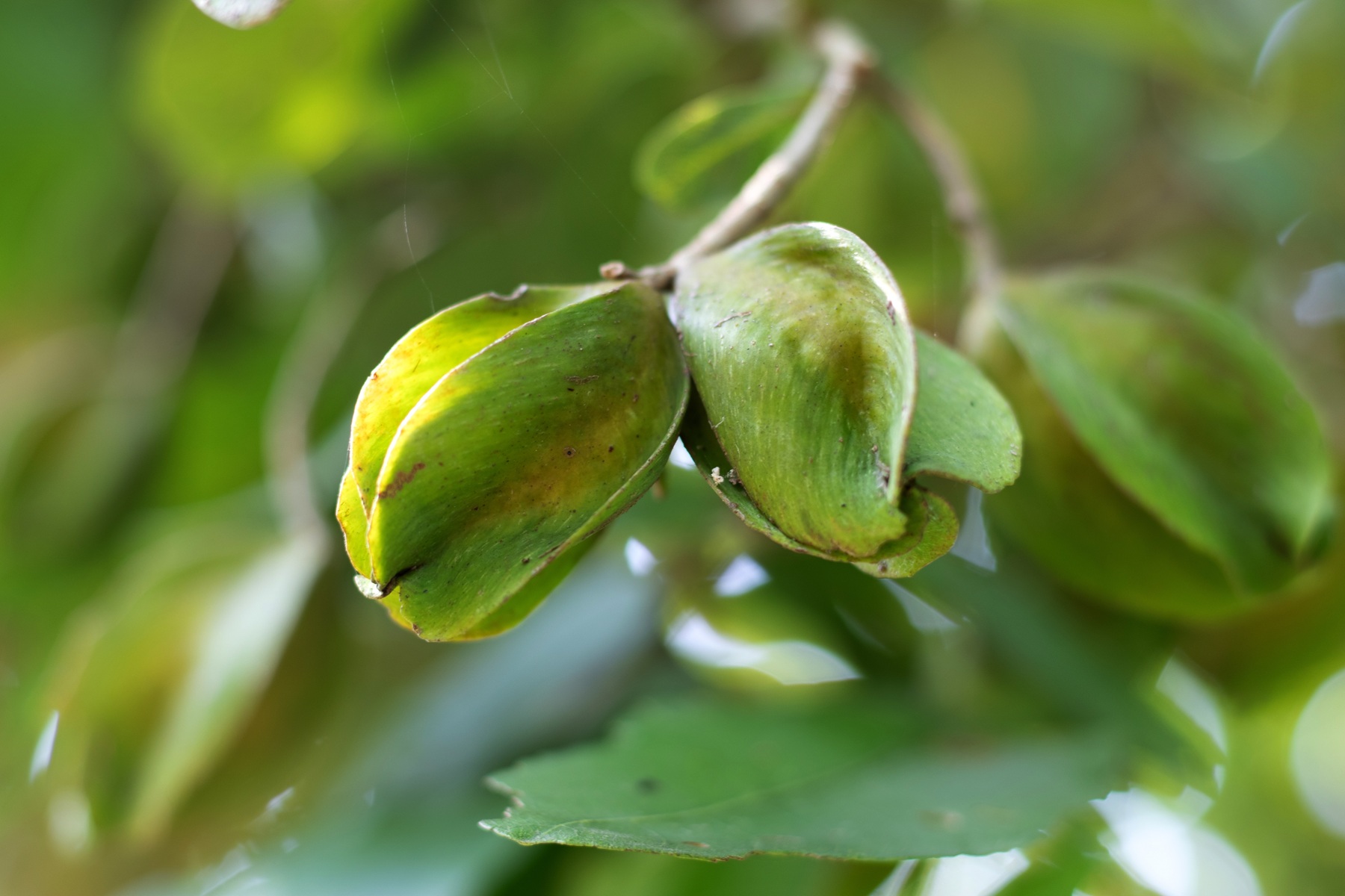 Arjuna is a large evergreen tree with typically pink-grey bark that peels away from the main frame of the trunk. It can grow up to 25 metres in height. The leaves can reach lengths of 15 cm and the flowers are cup-shaped and a pale yellow. The fruits are fibrous and woody and shaped into five ‘wings’ appearing between September and November.