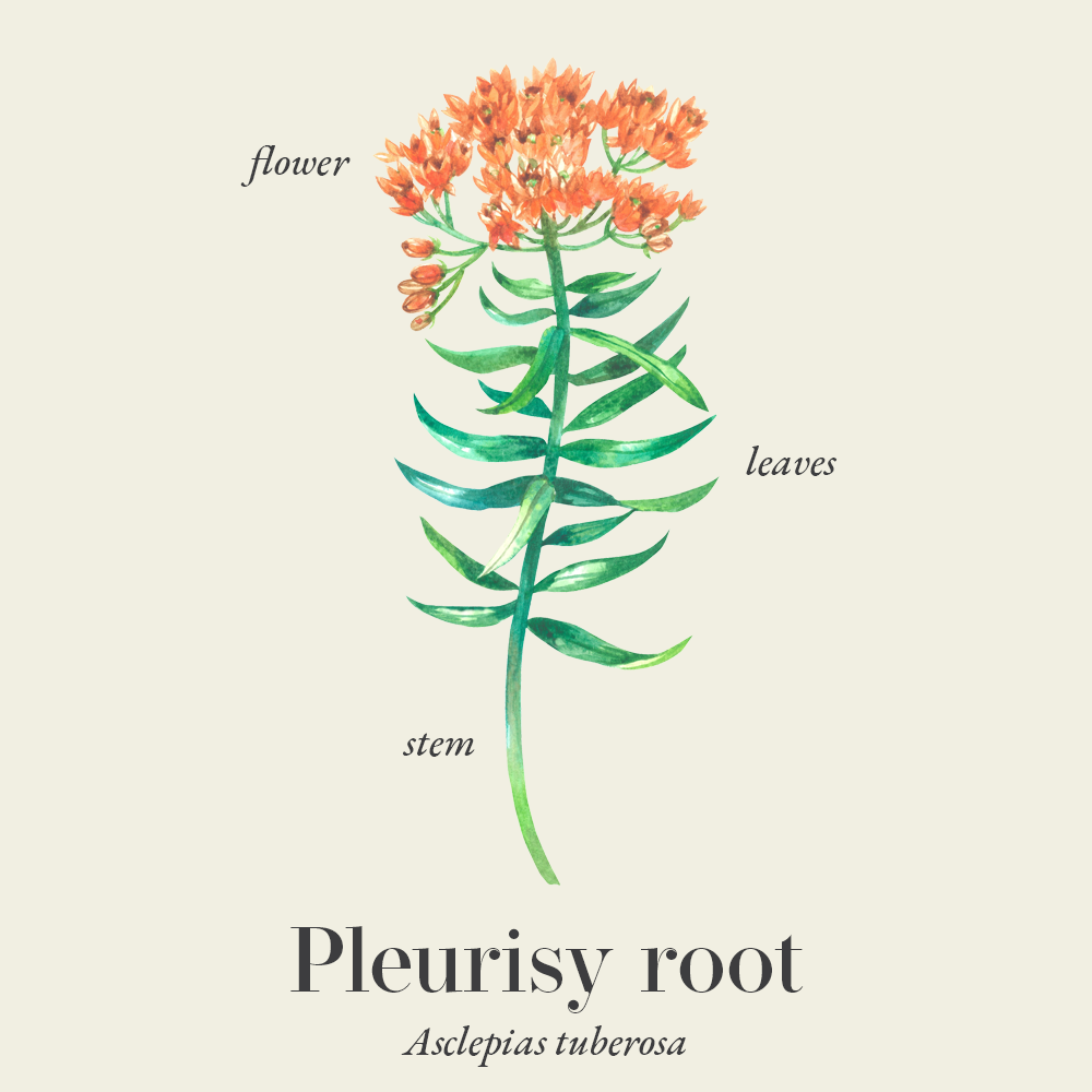 As the name suggests, pleurisy root is highly valued for the treatment of pleurisy, due to the antispasmodic, anodyne and diaphoretic actions (14). It has an action on the serous membranes to help reabsorb the pleural effusion to rebalance the moisture of the mucous surfaces (7,11). Pleurisy root brings moisture to the delicate membranes by opening pores, and decongesting mucus that has become stuck and stagnant (1). The anodyne, anti-inflammatory and antispasmodic actions reduce the pleural pain, pericardial pains, and relieve the pleuritic cough (7,11).